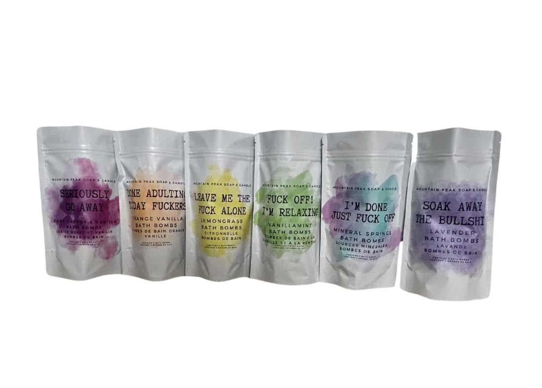 Soak away the bullshit with this new line of incredible bath bombs! 3 in each bag. Scented with essential oils or phalate free Fragrance oils, we’ve got a sentence saying sure to please all.