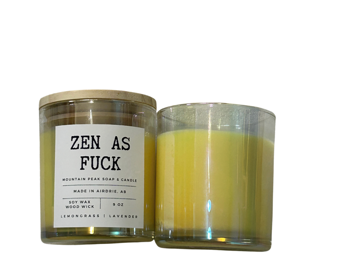 Our Zen as Fuck candle is scented with Lemongrass essential oil. It comes in a beautiful iridescent jar and wood lid. All of our candles contain wood wicks and soy wax candles. This candle features yellow wax.